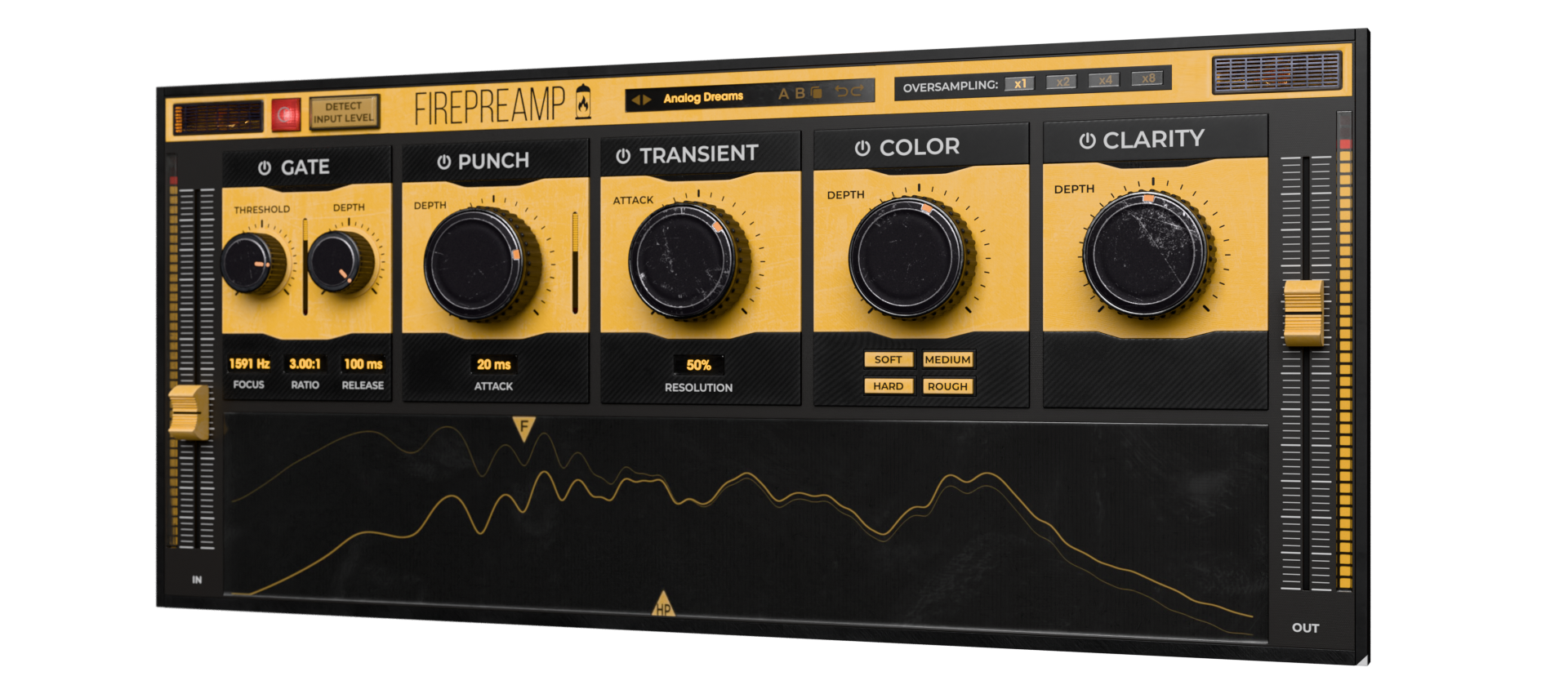 Standard gates often trigger incorrectly, but FirePreamp solves this with its unique Focus control. This lets you tune the gate to a specific frequency—like a snare's fundamental—ignoring bleed from hi-hats or cymbals. With additional controls for Depth, Ratio, and a precise Release for controlling sustain, this gate delivers results that are both powerful and musical.
